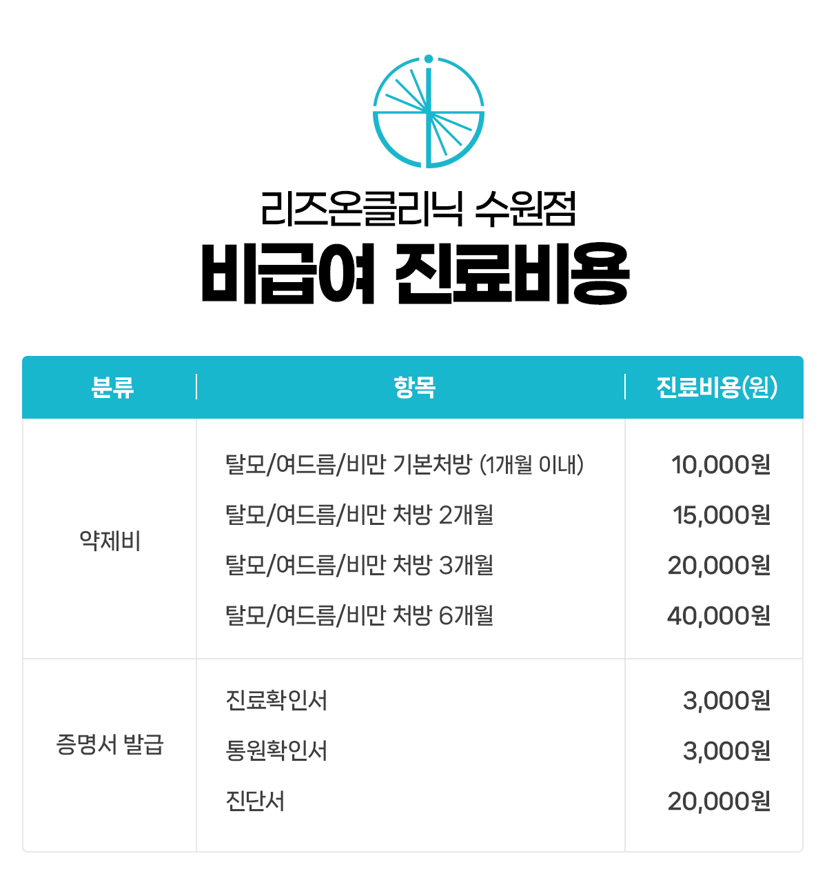 리즈온클리닉 수원점 비급여 진료비용 안내